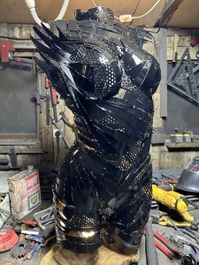 Description : 100 % récup., Buste peint noir et vernis, brillant. Sur tranche de noyer.